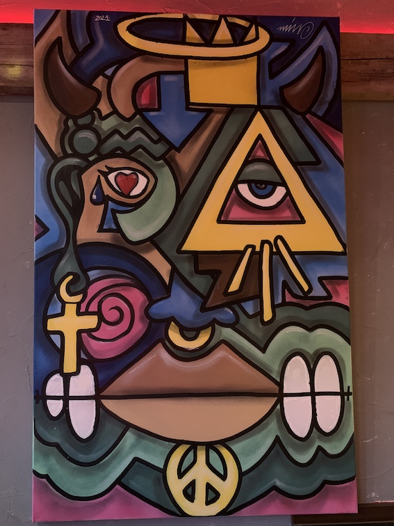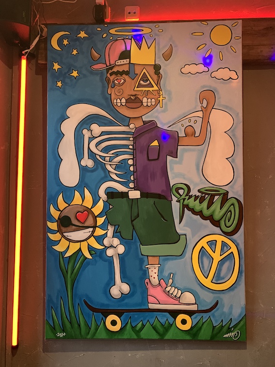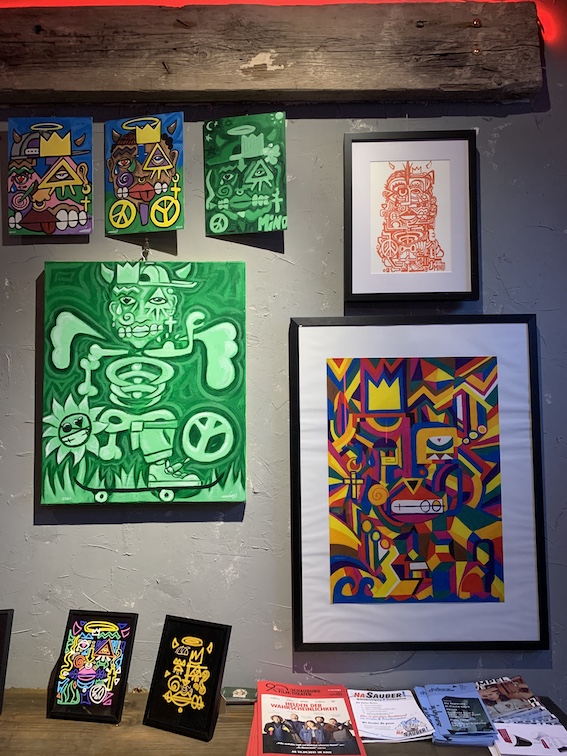 Mino war früher Sprayer und hat danach Kunst studiert. Wir haben ein paar sehr schöne Arbeiten an den Wänden.